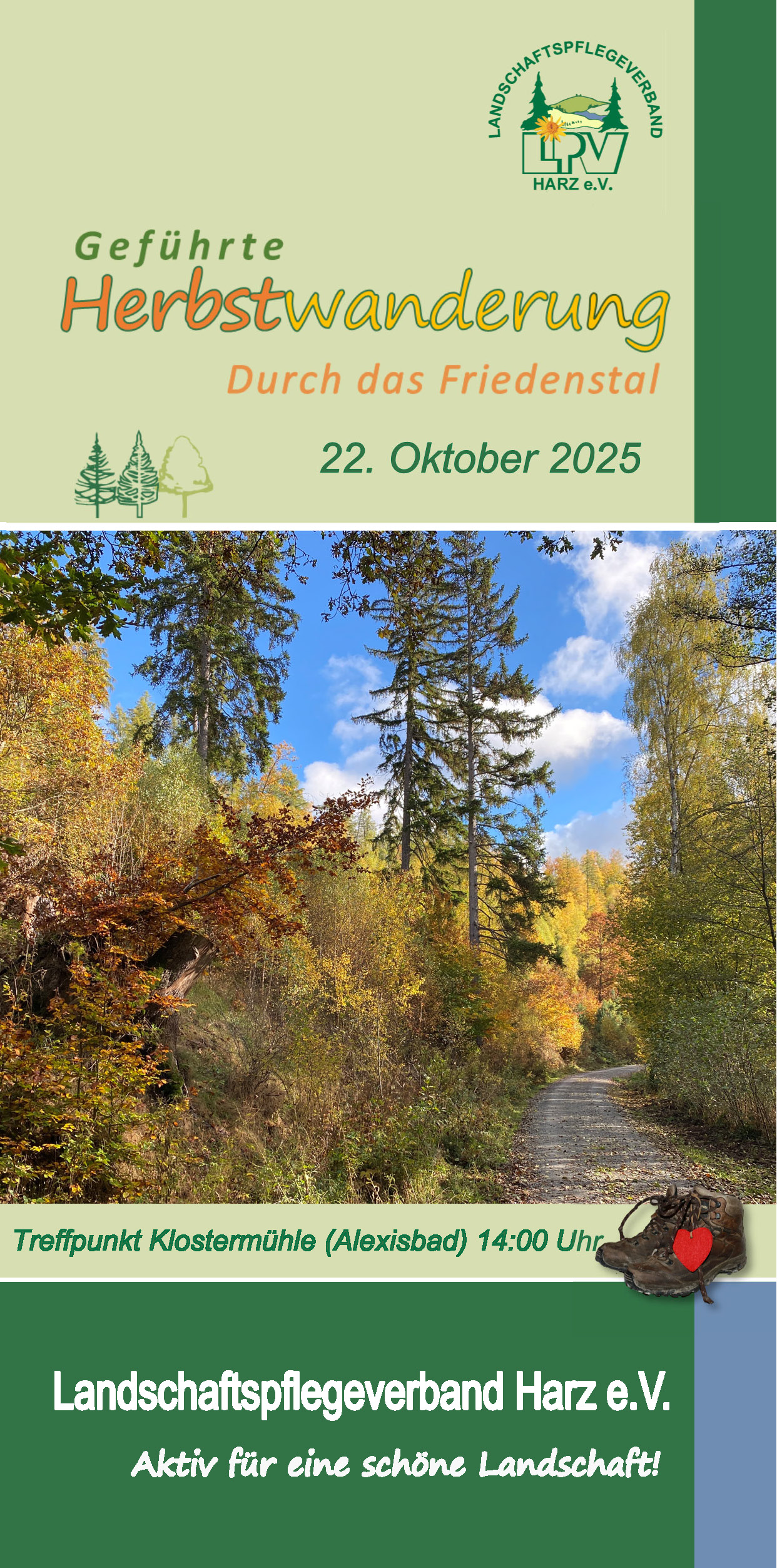 | 12.10.2025 | Waldwanderung Stiege/ Güntersberge | 14 - 17 Uhr |